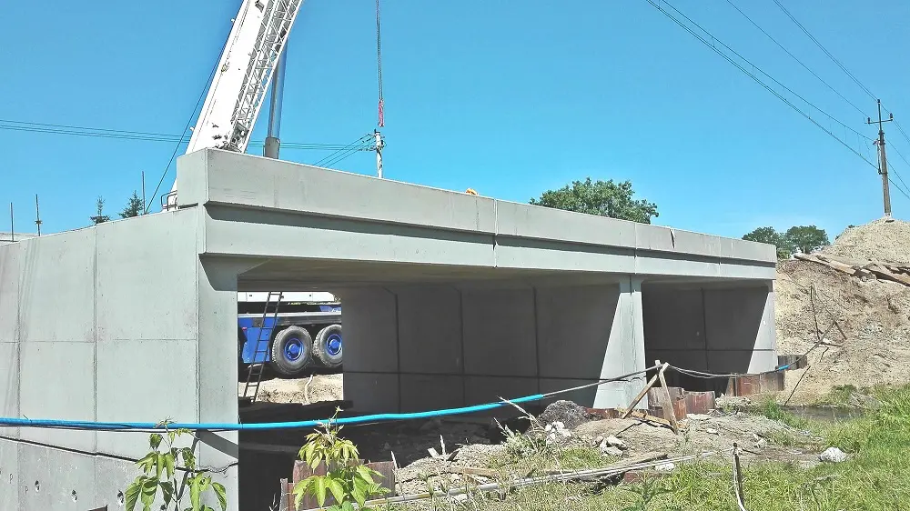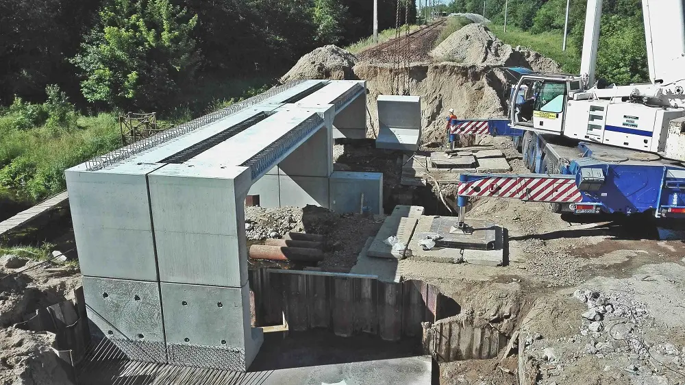 Dwuprzęsłowy most kolejowy wykonany z prefabrykowanych rygli, ścian bocznych oraz ścian środkowych systemu ABM FRAME. Poza standardowymi elementami zastosowano również prefabrykowany kołnierz.